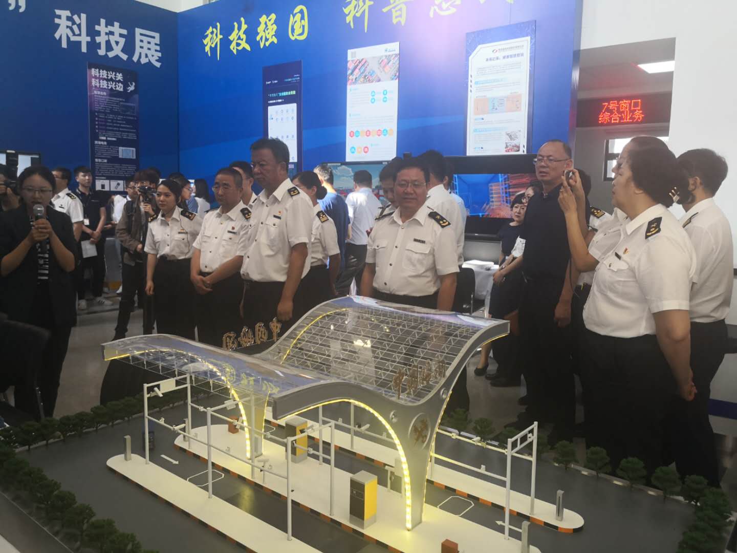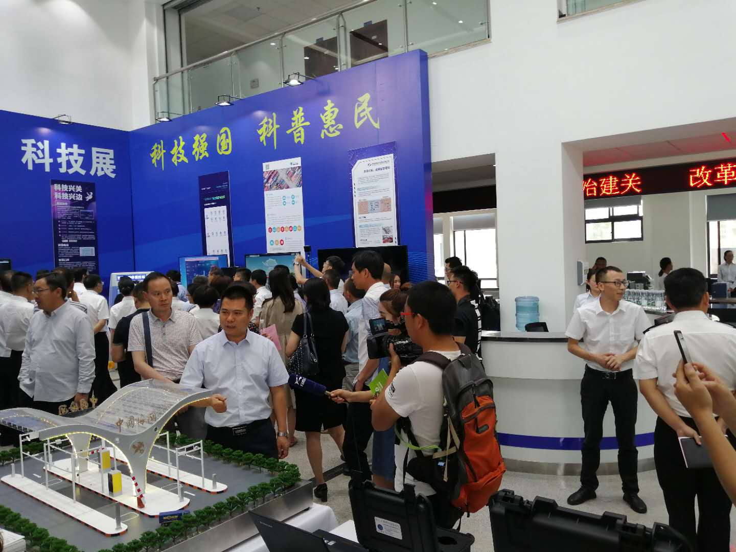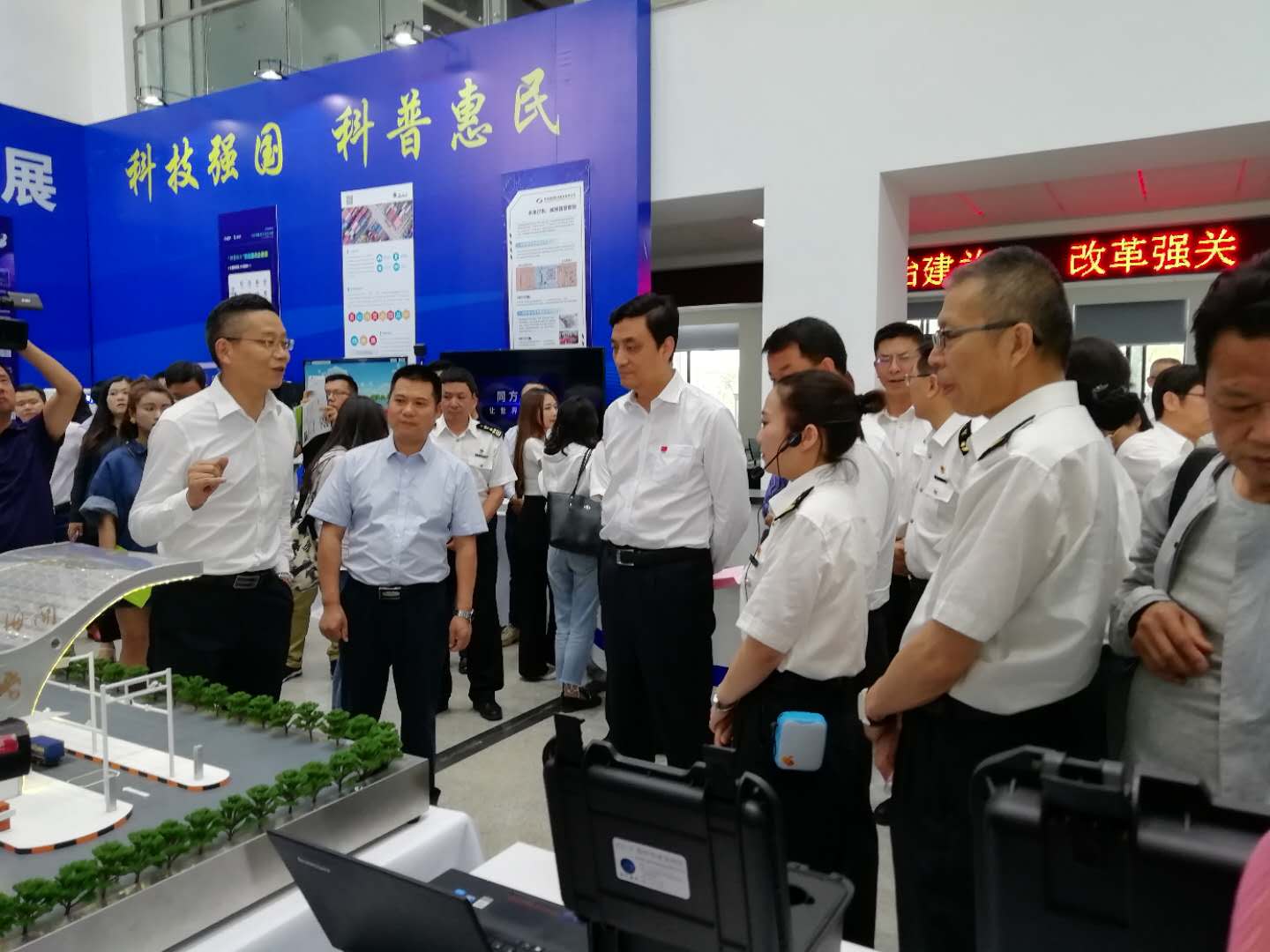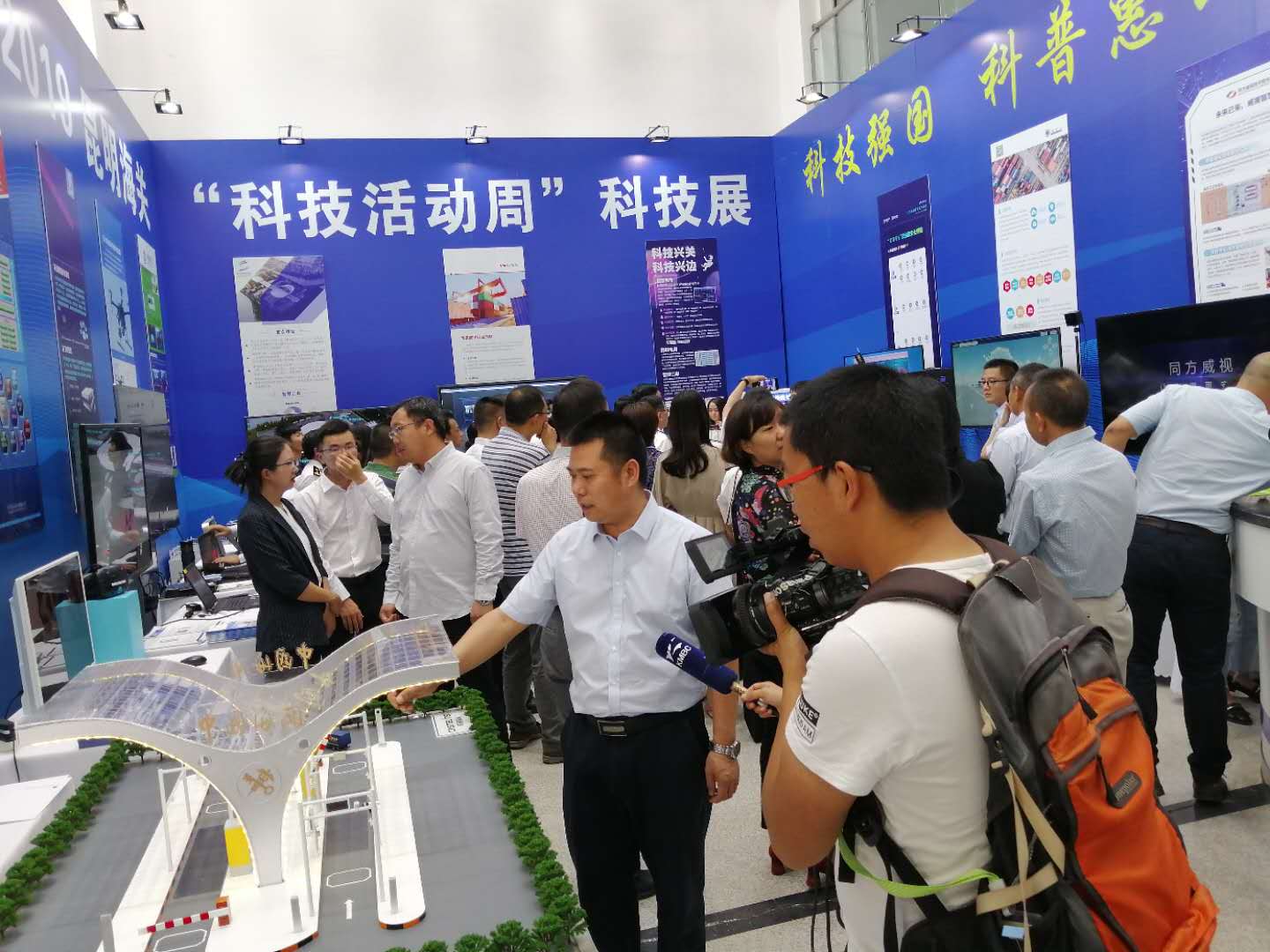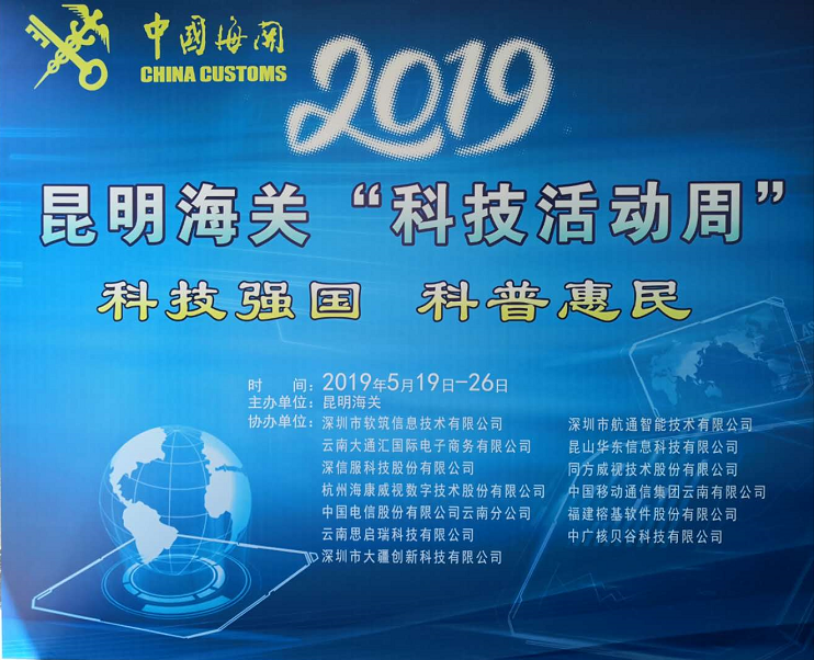 2019昆明海關(guān)“科技活動周”科技展于5月20日至5月26日在昆明海關(guān)一樓大廳正式開啟。本次活動周圍繞“科技強國、科普惠民”的主題,通過展板、展臺、體驗式交互等方式,對科技創(chuàng)新助力云南口岸通關(guān)便利化的發(fā)展歷程、重大成果以及未來規(guī)劃進(jìn)行了展示?;顒蝇F(xiàn)場航通展出了所開發(fā)的云卡口系統(tǒng)等智能化軟硬件設(shè)備、全景業(yè)務(wù)監(jiān)測平臺、跨境電商解決方案以及邊民互市貿(mào)易申報系統(tǒng)等全套解決方案。